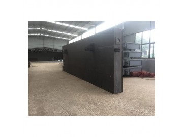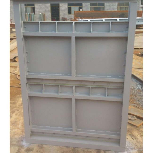 平面滑塊式鋼閘門,該閘門由門葉框架橡膠水封、鎖定梁、滑塊組成,該閘門除了密封止水外左右兩端沒有鎖定梁,當須檢修時,將閘門支撐在閘門槽上,滑塊采用含油尼龍,耐腐蝕且摩擦系數為鋼制的三分之一。